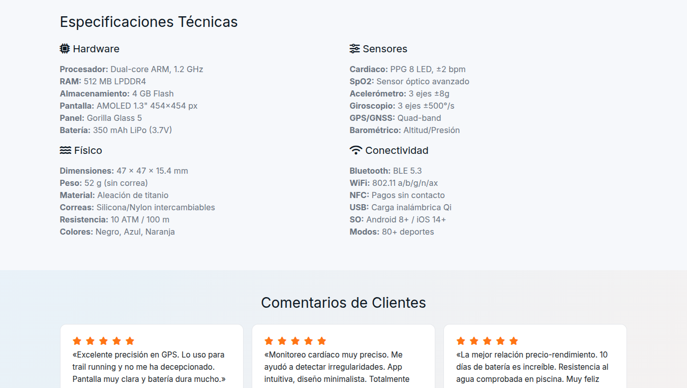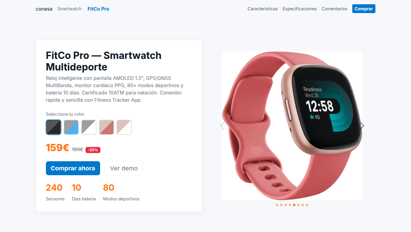 Proyecto de sitio estático que presenta el diseño de una página de producto. Incluye HTML, CSS y JavaScript mínimo, además de imágenes de producto Puedes ver el código fuente en Github: FitCo Pro repositorio.